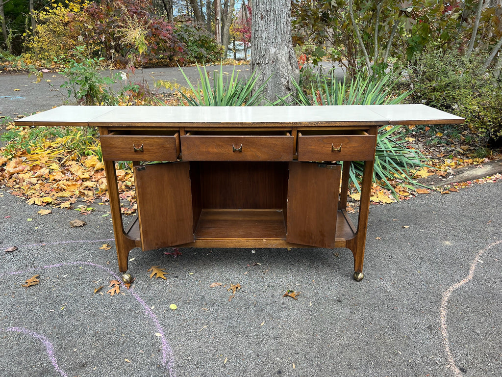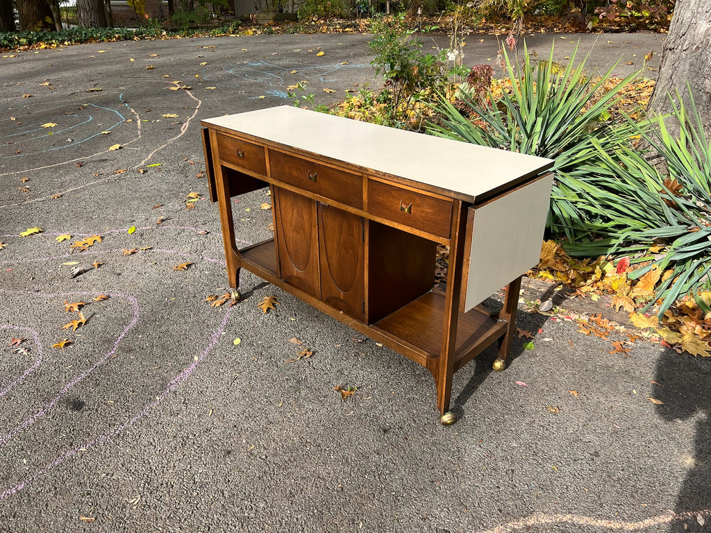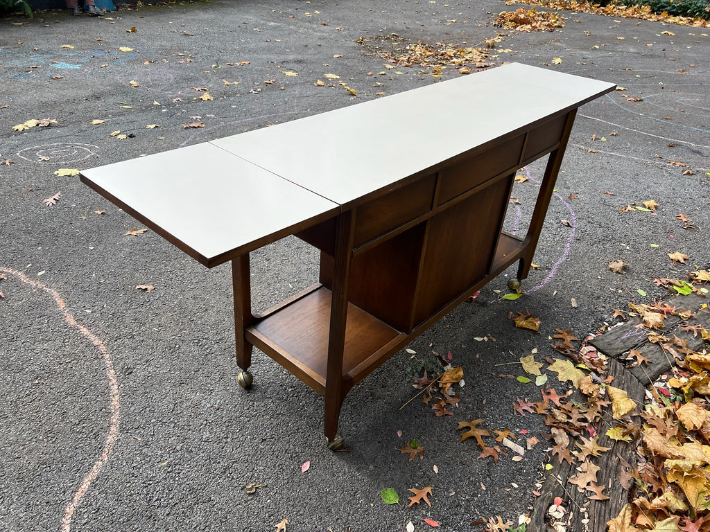 Iconic Broyhill Brasilia collection bar cart with fold up side to create an extended surface for serving. Durable white laminate top surface with one minor scuff mark. The bar is in very good vintage condition.