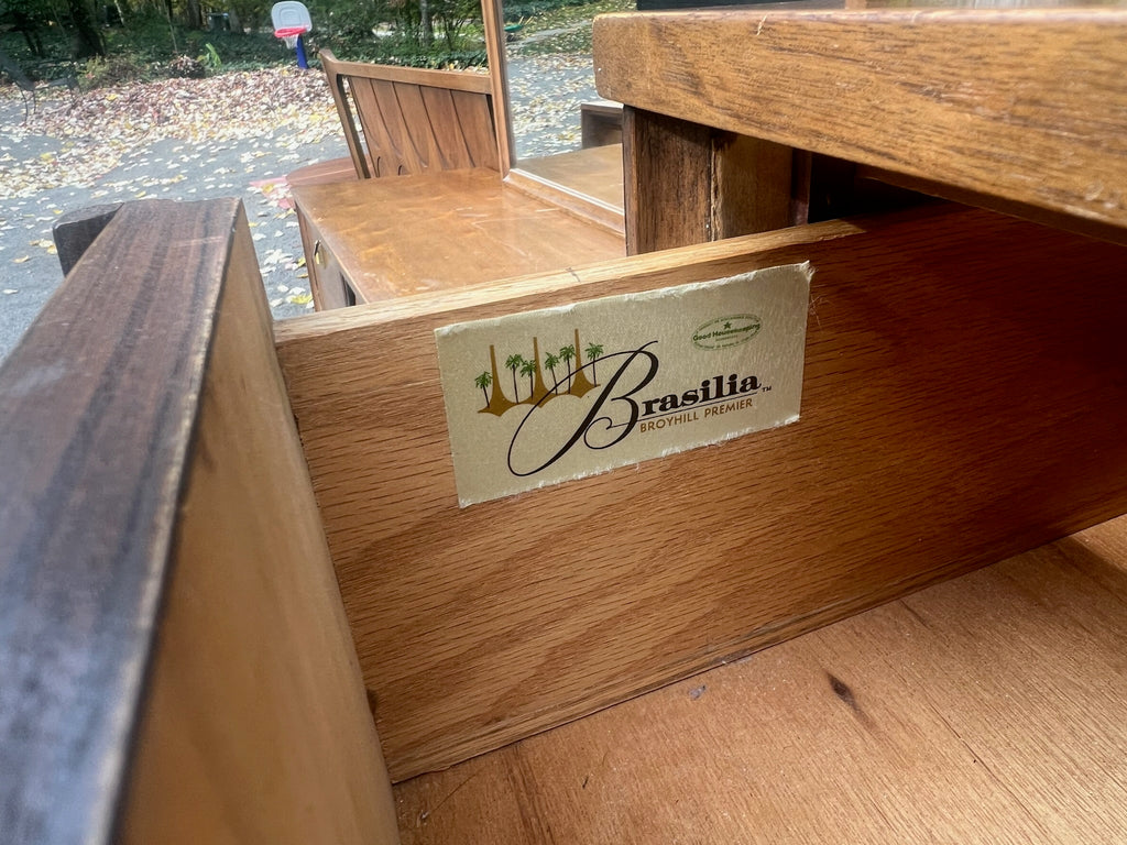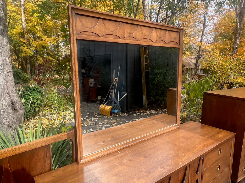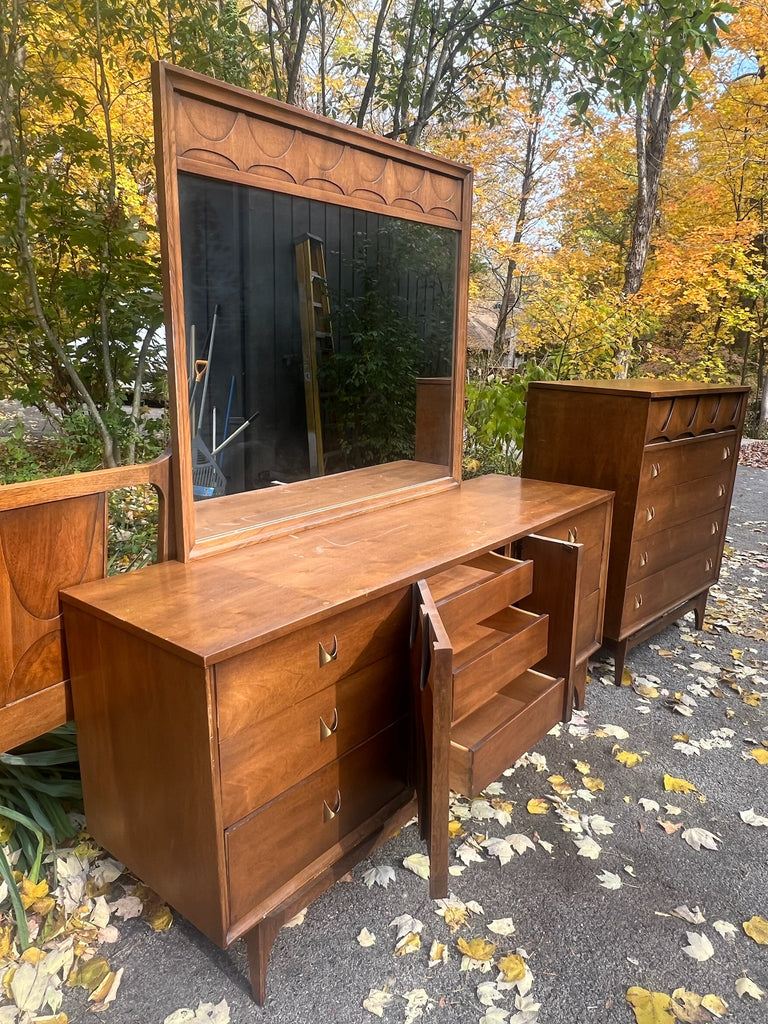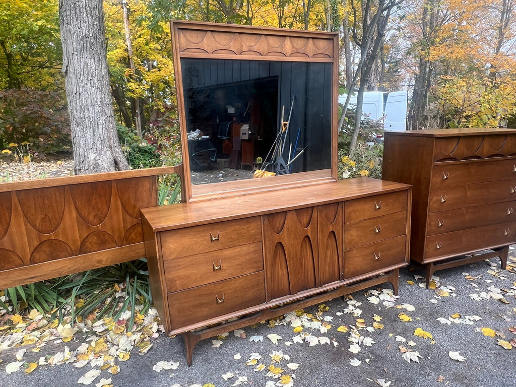 Iconic Broyhill Brasilia collection bedroom set that includes a lowboy dresser with large mirror, highboy dresser with five drawers and a queen size headboard.