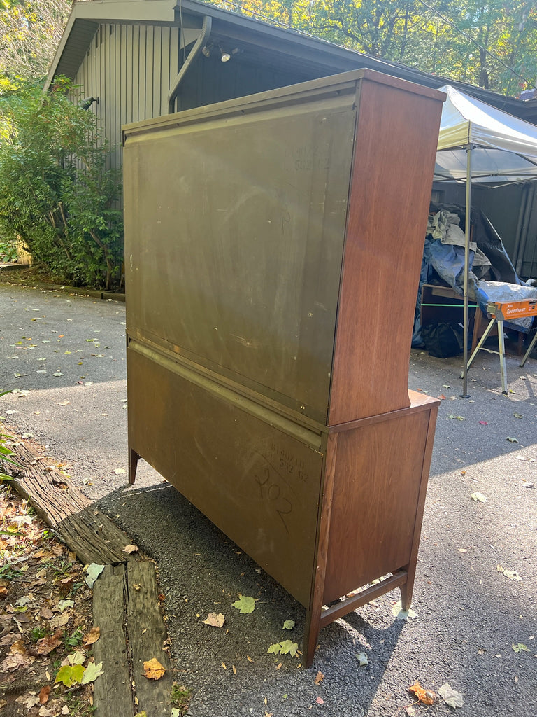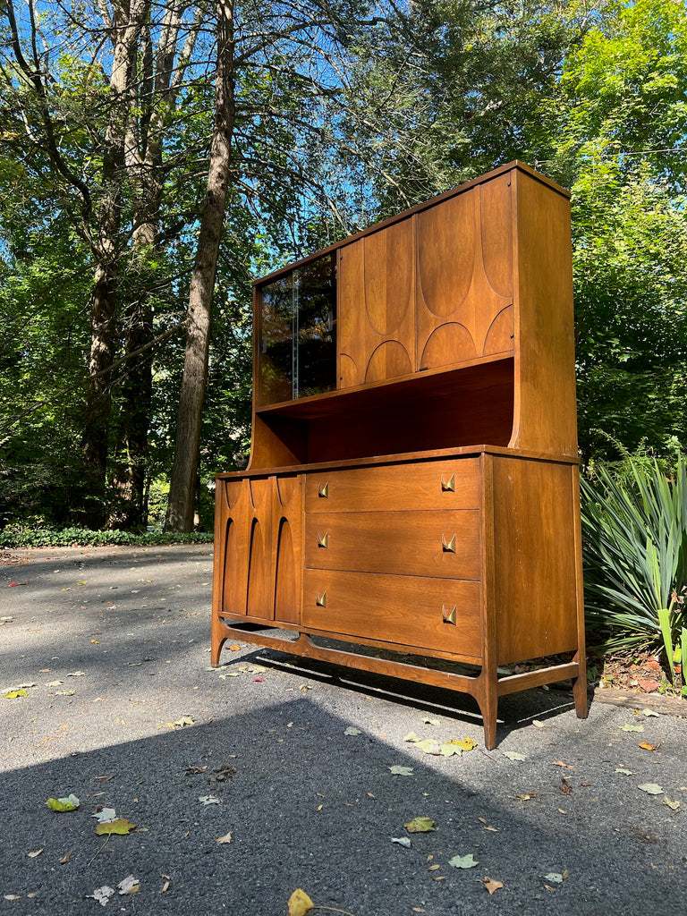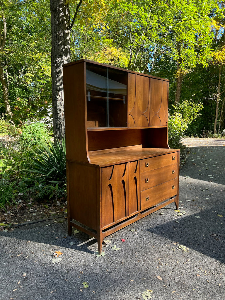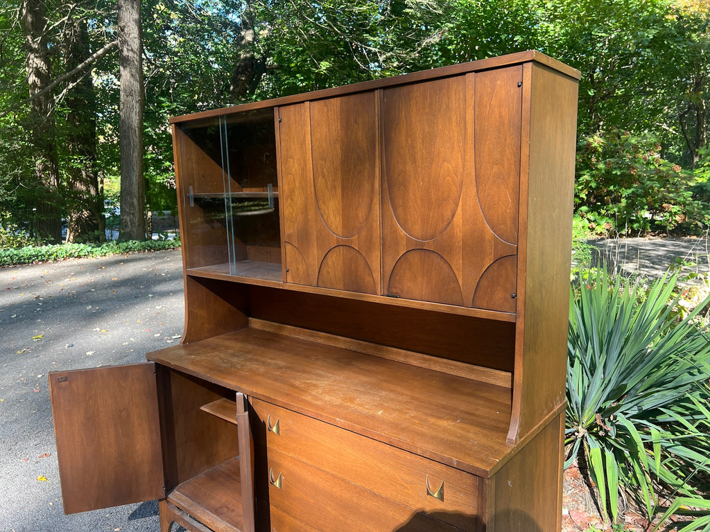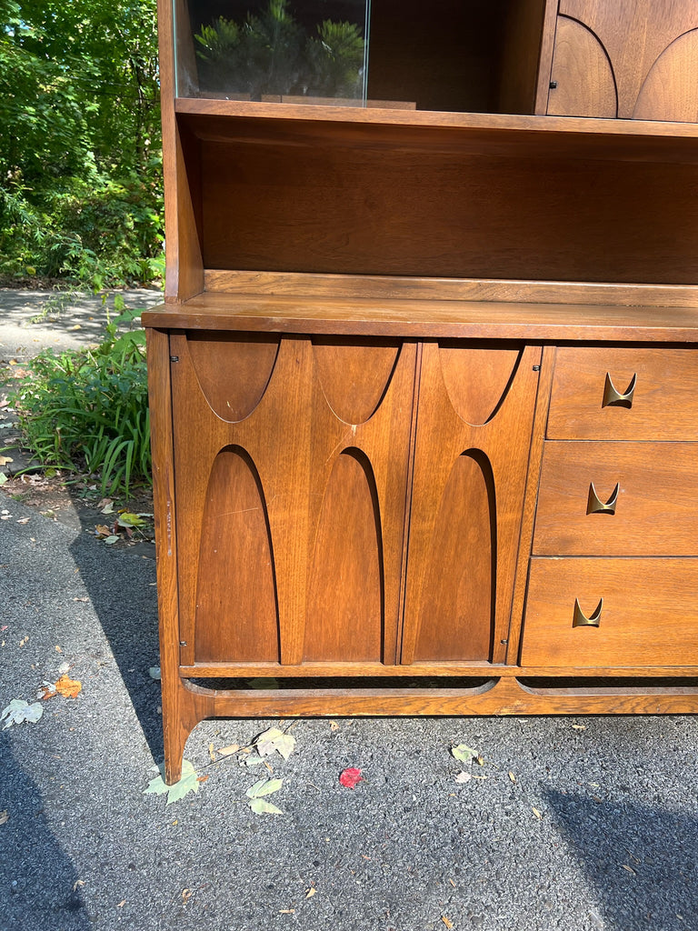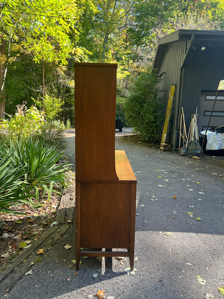 Rare two piece china cabinet with spacious surface area for serving or using it as bar area. Perfect for dry bar or as dining room hutch.