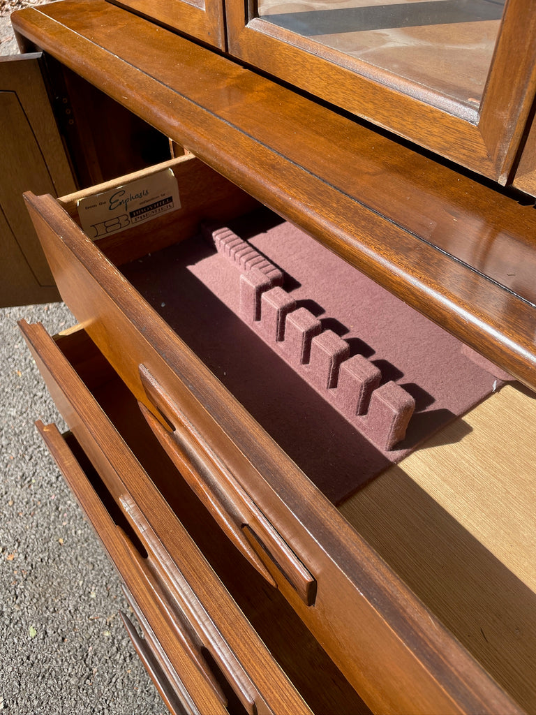 Vintage mid century modern Broyhill Emphasis two-piece China cabinet. In very good original condition, we will touch it up as needed to address any blemishes.