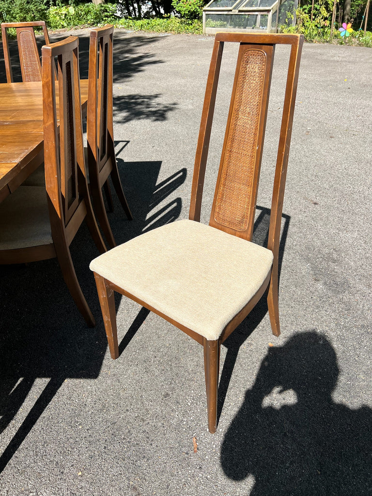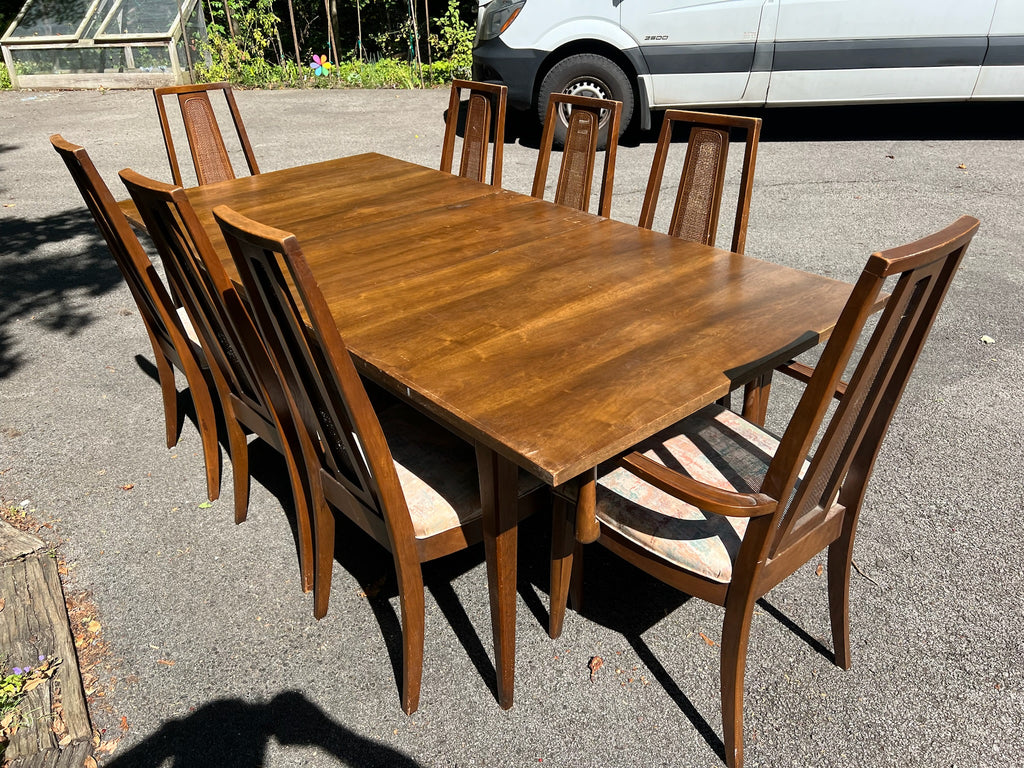 Classic MCM dining set by Broyhill from Emphasis collection. Features eight cane back chairs including two captains / armchairs.
