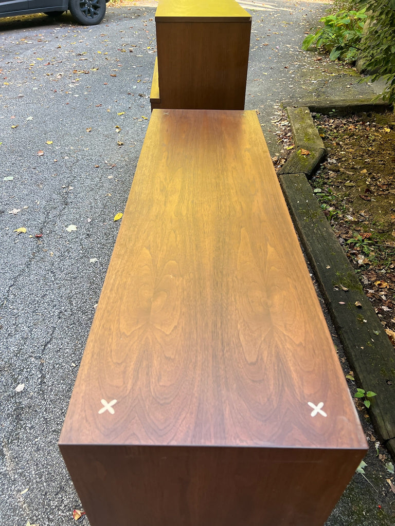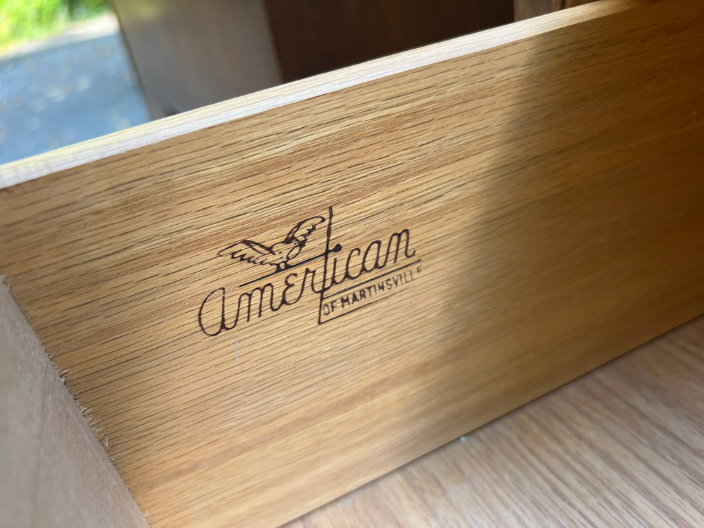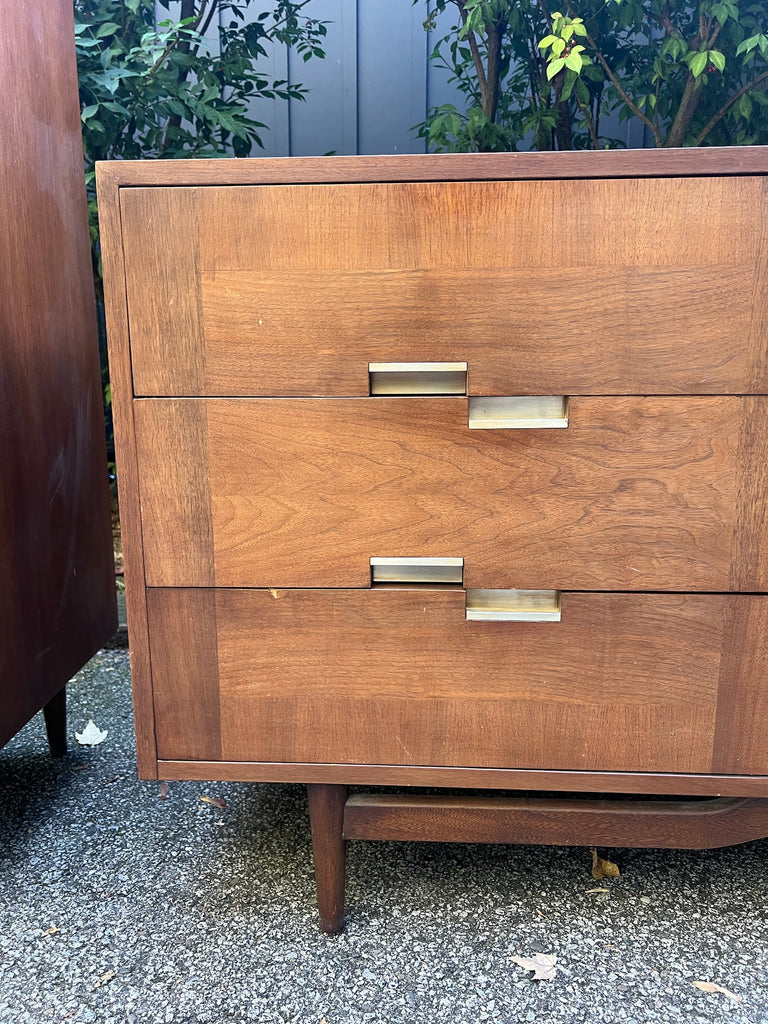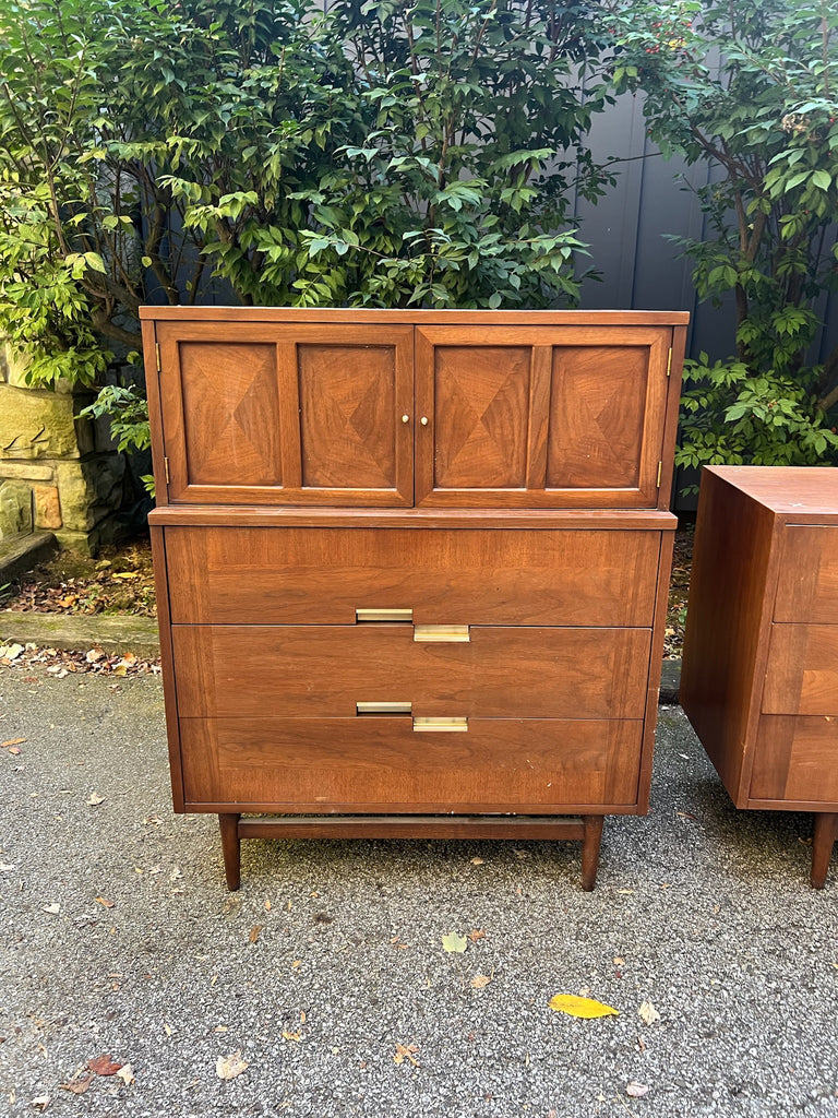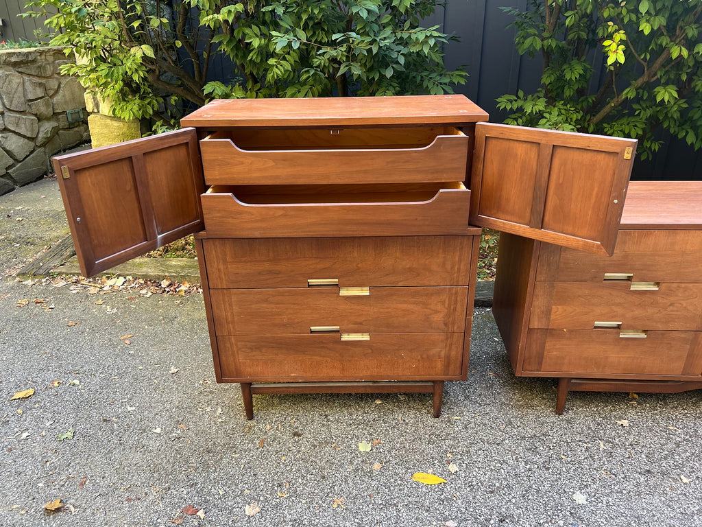 Beautiful vintage Mid Century Modern pair of American of Martinsville dressers. Gentleman’s chest with three large drawers and two smaller ones behind the doors. Spacious lowboy dresser with a range of larger and smaller drawers. Lowboy dresser also comes with a large mirror.