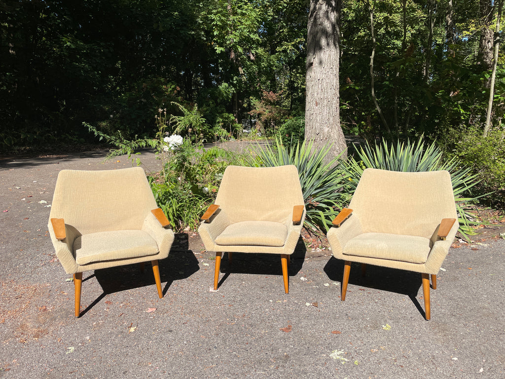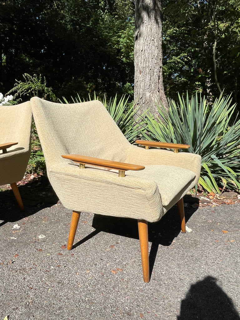 Elegant Mid Century Modern lounge chairs. No smells, stains or rips to the fabric. It is however aged and would benefit from reupholstery. This can be done for an additional cost. Please inquire for a quote.