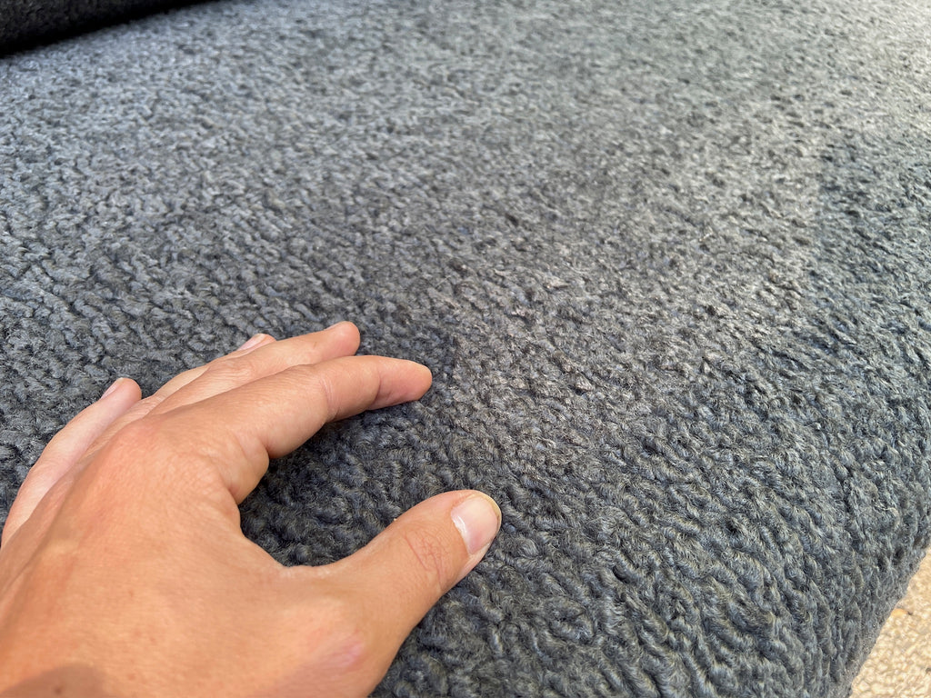 The fabric is a chunky, dark gray boucle. Soft and comfortable. The foam is all new and is comfortable. The sofa is like new but with that vintage quality and unique design.