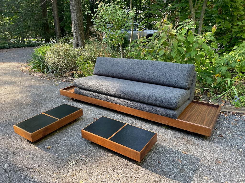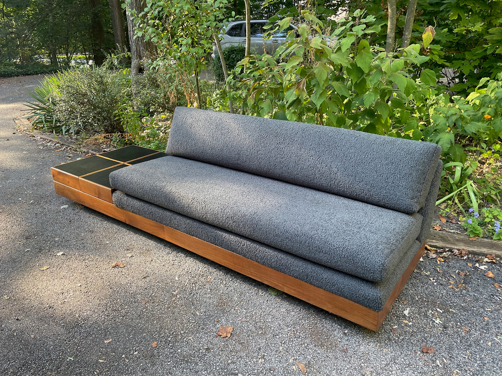 Unbelievably cool vintage mid century modern sofa. Just professionally reupholstered by Copley Upholstery, this beauty features two removable side / snack tables that can be pulled out and used on the ground or moved around to change how the sofa is used.